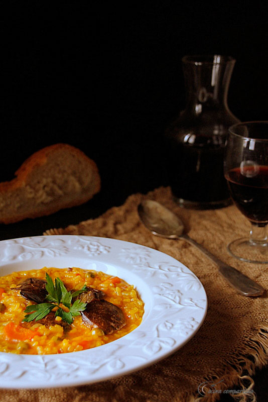 Este es un arroz tipo "guisote", medio "caldosillo" pero sin llegar a serlo... nada que ver con la paella.